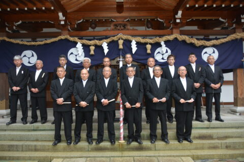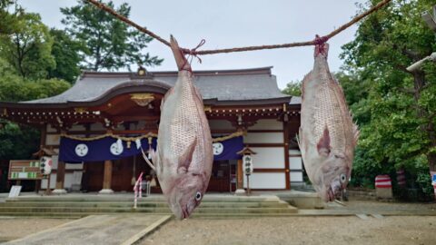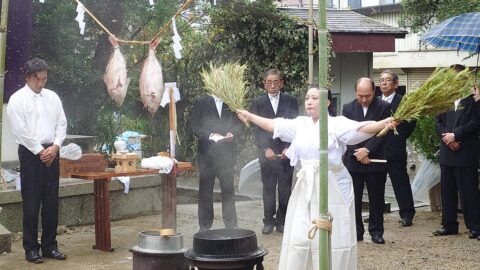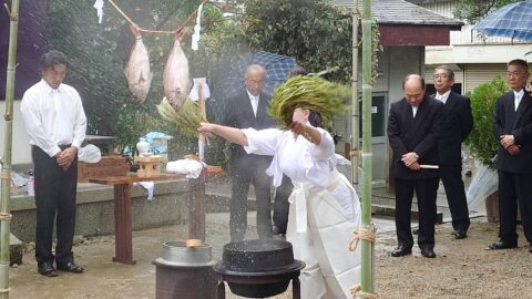 湯立神事 DATE:2025年10月4日(土)|CATEGOEY:社務日誌 明日の例祭を前に、午前10時より湯立神事が行われました。 関係者と境内のお祓いです。 雌雄の鯛は神様への御供えです。 本来は腹合わせで吊しますが、回転してしまったようです。 宮座十六人衆